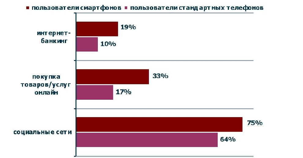 Выходя во Всемирную сеть при помощи смартфона, их владельцы чаще всего общаются в социальных сетях. 75% купивших смартфоны россиян проводят время за разговорами с друзьями, просматривая фотографии и видеоролики на сайтах социальных сетей (против 64% среди обладателей стандартных телефонов). Кроме того, они гораздо чаще, чем их коллеги со стандартными мобильными телефонами, совершают через телефон покупки онлайн (33% против 17%). Каждый пятый владелец смартфона пользуется услугой интернет-банкинг.