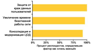По данным аналитиков, почти каждый из опрошенных ими сервис-провайдеров в новом году намерен увеличить инвестиции в обеспечение защиты своей сети и пользователей от атак и угроз информационной безопасности (ИБ), причем как в абсолютном денежном выражении, так и в доле этих затрат в общих капиталовложениях. Наибольшее влияние на эту тенденцию операторского рынка оказали следующие факторы: необходимость защиты данных пользователей и требования по увеличению времени безотказной работы сети, консолидация и структурные изменения в центрах обработки данных (ЦОДах), а также рост числа и сложности угроз безопасности (см. диаграмму).