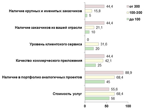 Как можем видеть на гистограмме, заказчики проектов в диапазоне до 100 тыс. руб. имеют существенный плюрализм в вопросе оценки подрядчика: все пункты оказываются менее важными, нежели цена, но и ценовой параметр отмечает лишь чуть более половины опрошенных. Это означает, что у представителей этого сегмента нет единого мнения об абсолютной важности какого-либо конкретного критерия. Такое положение существенно демократизирует рынок «недорогих» проектов: подрядчик с любым набором достоинств получает шанс найти «своего» клиента.