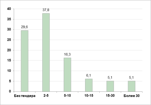 В ходе исследования респонденты отвечали на вопрос «Сколько компаний-разработчиков они приглашали для участия в тендере?» Выяснилось, что 29,6% заказчиков вообще не организуют тендер, а сразу начинают работать с конкретным исполнителем, а 37,8% заказчиков устраивают «соревнование» между 2-5 разработчиками (см. рисунок).