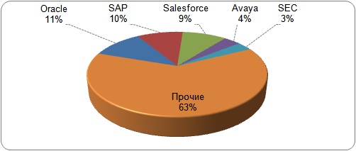 Что касается конкуренции между вендорами, то аналитики отмечают интересное развитие событий. Доли ведущих поставщиков почти совпадают, отличаясь на один процент или даже менее (см. диаграмму). Одним из средств дифференциации вендоров является их присутствие в разных географических регионах. Так, Oracle лидирует в Азиатско-Тихоокеанском регионе (кроме Японии), Salesforce.com имеет сильные позиции в Северной Америке и Японии, а SAP занимает первое место в регионе EMEA и в Латинской Америке.