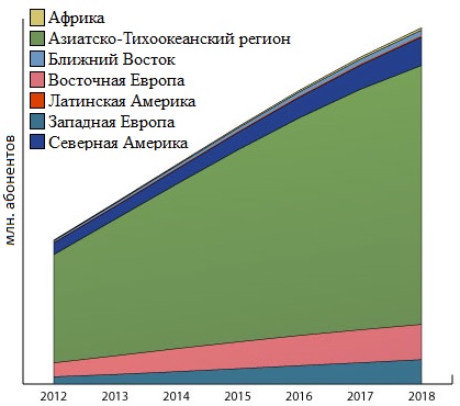 Прогноз развития абонентской базы пользователей оптоволоконного доступа по регионам мира, 2012-2018 гг.