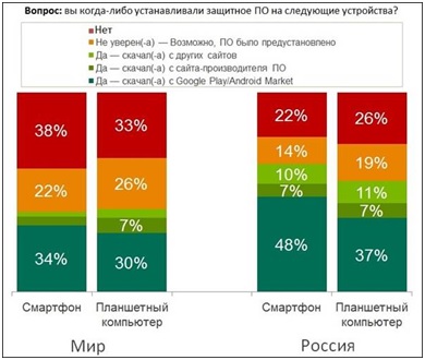 Российские пользователи — одни из самых ответственных в мире и в большинстве своем установили специализированное защитное ПО на свои мобильные устройства. Так поступили 65% владельцев смартфонов и 55% владельцев планшетов на базе Android. И это значительно больше, чем в целом по миру. Таков один из итогов опроса, проведенного компанией B2B International совместно с «Лабораторией Касперского» летом 2013 г*.