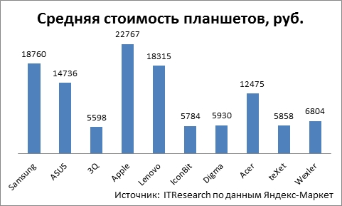 По данным Яндекс-Маркет http://www.market.yandex.ru/ , в России на середину июня 2014 г. средняя стоимость планшетов составляла 11195 руб. (близко к средневзвешенной по продажам, определяемой аналитической компанией ITResearch). При этом стоимость продукции различных производителей крайне сильно различается. При сравнении данного параметра для 10 компаний с самым насыщенным продуктовым предложений видно, что он может отличаться в 4 и более раз (см. рисунок).