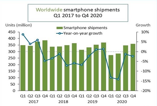 Рис. 1. Динамика мирового рынка смартфонов в период Q1 2017- Q42020