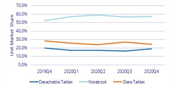 В четвёртом квартале поставки detachable-планшетов выросли на 27.9%, чему, в том числе, способствовал выход на рынок подобных новых моделей от Microsoft и Apple. Кроме того, такие модели активно покупали вместо ноутбуков, которые поступали на рынок с задержками. Но и поставки обычных плоских (slate) планшетов увеличились за квартал на 13.7% — потребители охотно брали их для фильмов, игр и прочих развлечений.