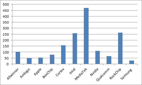 Чипами Cortex оборудованы около 160 моделей, Allwinner и Nvidia — чуть более 100. Среди оставшихся примерно 15 производителей также можно отметить ощутимые поставки моделей на чипах Amlogic, Apple, BoxChip, Qualcomm и Samsung.
