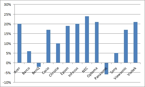 При этом продукция ведущих вендоров росла разными темпами (см. рисунок). Но в целом наблюдалась такая закономерность, что продукция «массовых» брендов росла быстрее рынка — примерно на 20%. Только для компании BenQ наблюдалось общее снижение средней стоимости продукции.