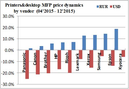 В свою очередь, у компаний Brother и Canon рублевые цены выросли незначительно, в то время как на «первом этапе» нестабильности рубля продукты этих вендоров дорожали больше, чем у других. Всего на 5-6% в среднем подорожали в рублях продукты HP, которые на «первом этапе» поднялись в цене на 25-30%.