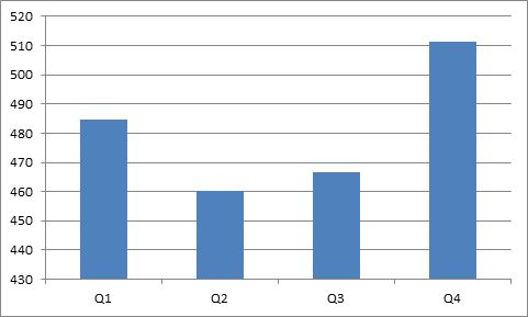 Средневзвешенные цены на настольные ПК по кварталам 2015 г. (в долл.)