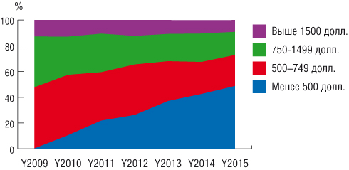 Сегмент сверхдешевых устройств (стоимостью менее 500 долл.) зародился относительно недавно, в 2009 г. эти проекторы составляли всего лишь мизерные 0,18% рынка. Однако в последнее время сегмент быстрыми и стабильными темпами набирает популярность (см. рисунок), и по итогам же прошлого года дешевые проекторы контролировали уже почти половину продаж, став самым емким сегментом рынка. Конечно, при этом в деньгах данная группа генерирует довольно малозначимый поток, поэтому она интересна далеко не для всех участников рынка, являясь рабочей «поляной» лишь для нескольких компаний, лидеров массового рынка.