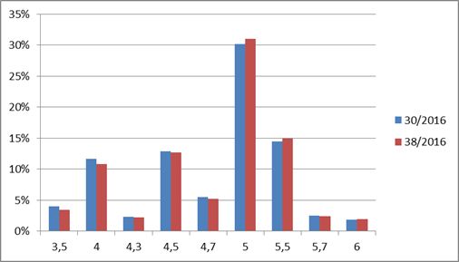 При этом на российском рынке представлены модели с широким спектром типоразмеров, вплоть до 6,8 дюймов, где смартфоны уже напрямую пересекаются с планшетами. Но основных типоразмеров девять, с диагональю от 3,5 до 6 дюймов (см. рис. 1). Среди них есть выраженный лидер — это 5 дюймов. Таким экраном на конец сентября было оборудовано более 30% всех представленных на рынке смартфонов, причем здесь есть выраженный тенденция к росту. В целом есть тренд к росту всех больших диагоналей и уменьшению доли типоразмеров менее 5 дюймов.