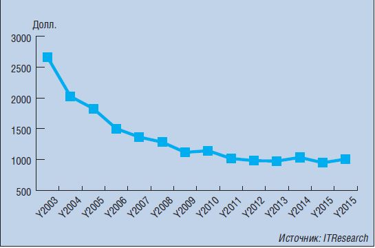 По данным аналитической компании ITResearch, средневзвешенная стоимость проекторов на российском рынке по итогам 2016 г. составила примерно 1000 долл. История наблюдений показывает, что на этом уровне данный параметр держится уже несколько лет (см. рисунок).