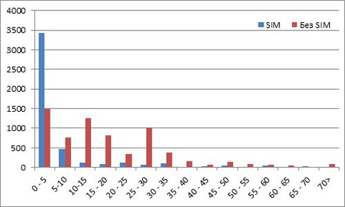 Для наглядности на рисунке приведено распределение предложений часов c SIM и без по ценовым диапазонам с шагом 5 тыс. руб.