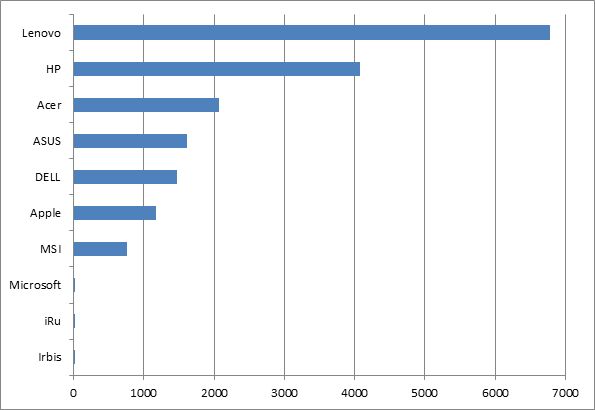 Впрочем, и после такого сведения ассортимент HP остался самым широким — 33 модели. Далее, по широте номенклатуры следуют Lenovo (21) и Acer (15).