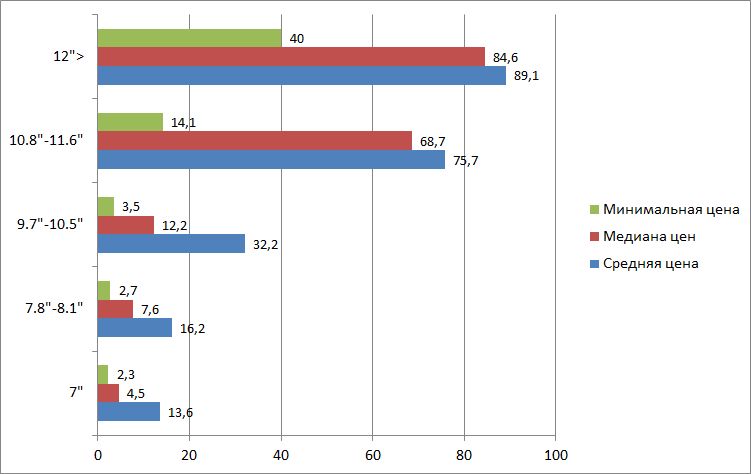 Средний ценник на самый распространенный вид планшета — 10-дюймовый — 32 000 руб. Но ценовой разброс здесь очень большой. Медиана существенно ниже — всего 12 000 руб.