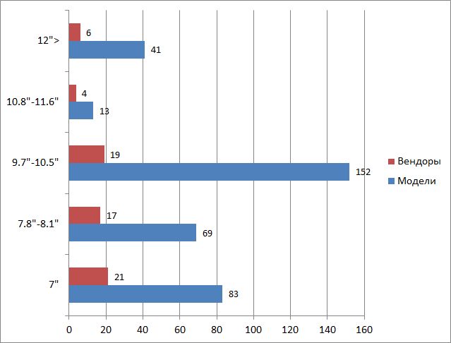 Большая часть предложений относится к полноразмерным десятидюймовым планшетом с экранами от 9.7″ до 10.5″. Таких 152 модели от 19 вендоров. (рис. 1.) Такое опережение наблюдалось не всегда. В предыдущее годы сегментом правили сверхдешевые 7-дюймовые планшеты, но сегодня, как видим, их представленность существенно сократилась.