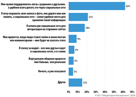 Как и ожидалось, самой популярной причиной, по которой люди вынуждены продолжать пользоваться социальными сетями, стала необходимость поддерживать общение со своими друзьями и родственниками — на это сослались 62% респондентов (см. рис. 1).