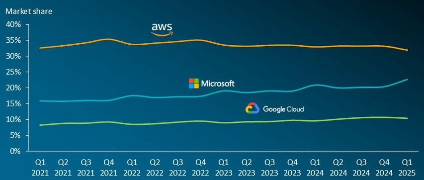 За I кв. 2025 г., по оценке Canalys, заказчики по всему миру израсходовали на облачные инфраструктурные сервисы (только инфраструктурные, т. е. подменяющие собой развёртывание и эксплуатацию соответствующего оборудования on-premises) 90,9 млрд долл. США — на целый 21% больше, чем за аналогичный период годом ранее (см. рисунок).