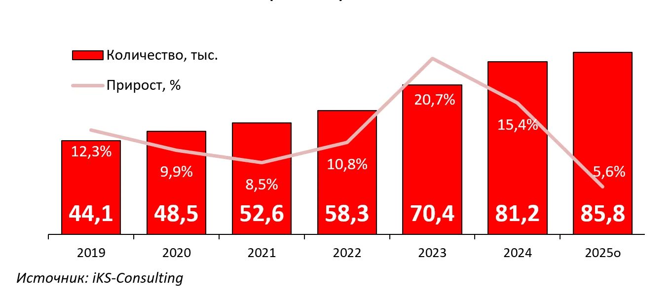 Рост числа стойко-мест (тыс. шт.) в РФ в 2019–2025 гг.