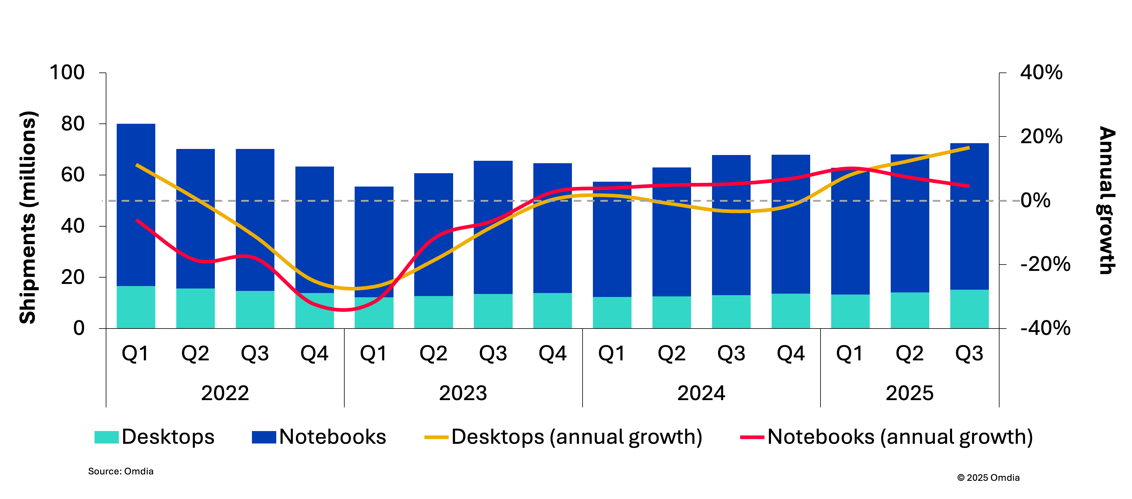 По оценке Omdia, за III кв. 2025 г. в мире было отгружено 72 млн персональных компьютеров всех разновидностей (включая рабочие станции), что на 6,8% больше, чем за аналогичный прошлогодний период. И хотя поставки ноутбуков продемонстрировали весьма скромный рост, на уровне 4%, заметно уступившие им по объёму отгрузок десктопы (15,2 млн единиц против 57,2 млн) прибавили год к году сразу 17%.