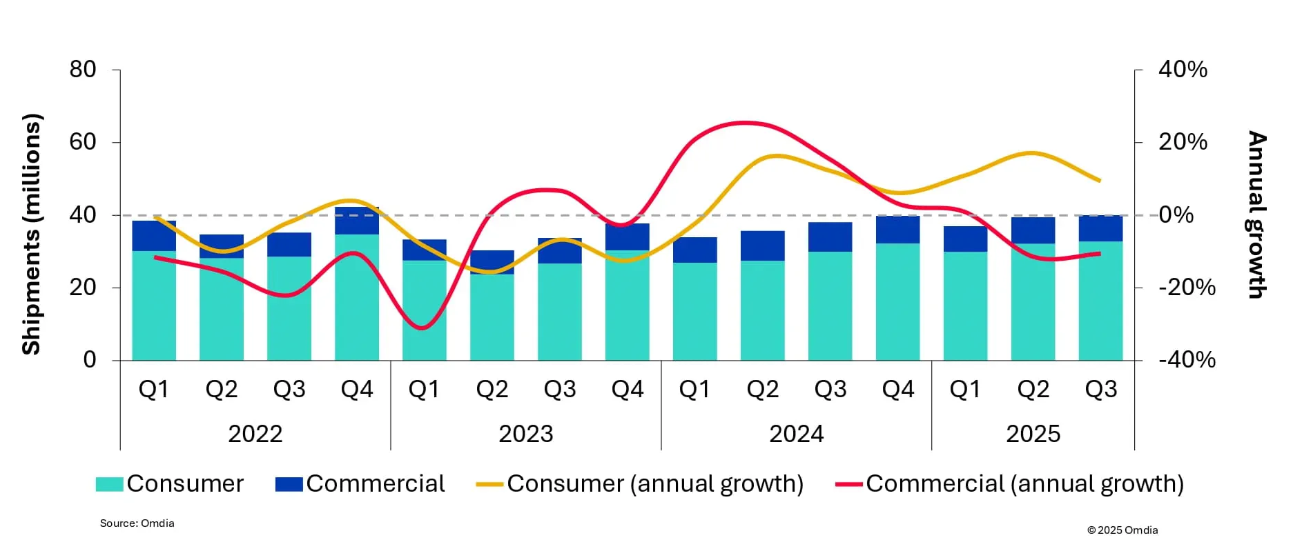 Согласно оценке Omdia, за III кв. 2025 г. в мире было отгружено 40,0 млн планшетов (включая хромбуки), — на 5,1% больше, чем за аналогичный период прошлого года. Это уже седьмой квартал подряд с положительной динамикой поставок «таблеток» в канал продаж. Более того, указывают аналитики, тенденция распределения этих поставок по кварталам в нынешнем году схожа с той, что фиксировалась в 2024-м (и отличается от наблюдавшейся по меньшей мере два прежних года подряд): постепенное, от I кв. к IV кв., наращивание отгрузок с пиком как раз в последние три месяца, в сезон наиболее щедрых ежегодных распродаж.