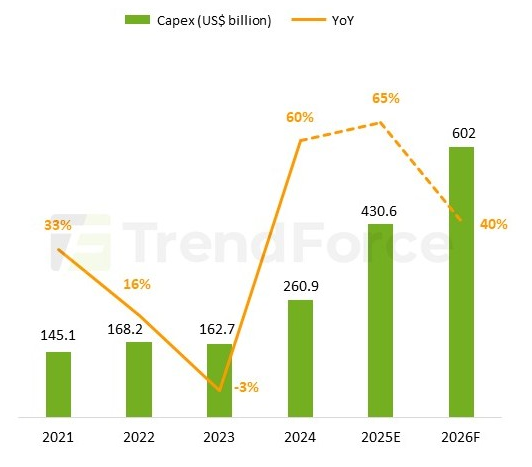 Ещё недавно в TrendForce уверенно пророчили, что одни только капитальные расходы (CAPEX) всего лишь восьми лидирующих провайдеров облачных услуг в мире вырастут по итогам текущего года сразу на 61% от достигнутого в 2024 г. рекордного уровня в 260,9 млрд долл. США. Однако в начале ноября и эту смелую оценку пришлось пересмотреть в сторону ещё большего увеличения: теперь годовой прирост этих затрат оценивается в 65%, — до значения 430,6 млрд долл. И признаков разворота наметившейся ещё в 2023-м тенденции пока не видно: в будущем году, считают аналитики, CAPEX первой восьмёрки гиперскейлеров планеты (а это Google, AWS, экстремистская Meta, Microsoft, и Oracle в США — плюс Tencent, Alibaba и Baidu в КНР) увеличится ещё по меньшей мере на 40% , до 602 млрд долл.
