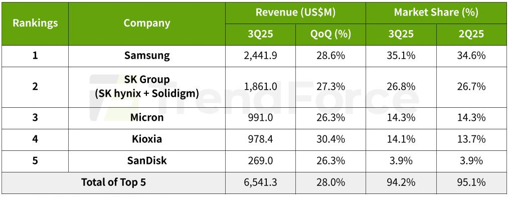 Первая пятёрка поставщиков корпоративных SSD в мире по отгрузкам в денежном выражении за III кв. 2025 г., млн долл. США, в сравнении с их же показателями предшествующего квартала