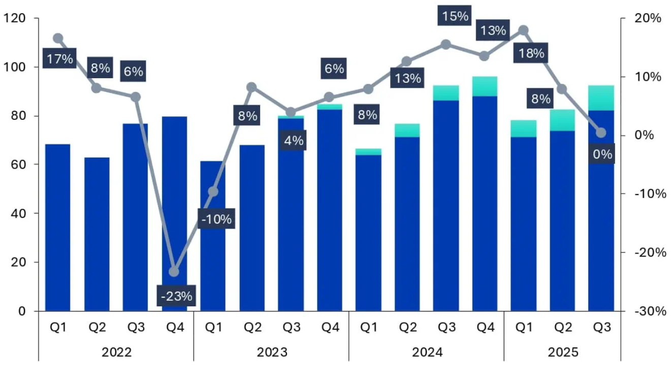 Глобальные поставки TWS по кварталам, млн единиц, столбцы (тёмные фрагменты — вкладные разновидности, светлые — OWS), и их годовая динамика, линия, %