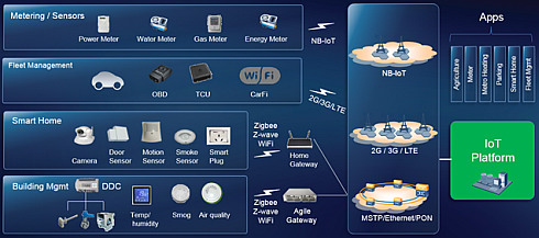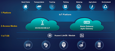 Huawei решает задачу подключения датчиков «умного дома», автомобилей, промышленных систем с помощью специализированных шлюзов в традиционные проводные или беспроводные сети (GSM, 3G, LTE, Wi-Fi). Автономные датчики, разбросанные по большой территории, налагают особые требования: устройство должно иметь минимальные энергопотребление и стоимость, а транспортная сеть может быть только беспроводной. Такая задача решается с помощью сопрягающего чипа на базе LiteOS, а связь наиболее целесообразно осуществлять через существующие сотовые сети, для чего Huawei разработал технологию NB-IoT. Сотовые сети есть практически везде, и для внедрения можно задействовать существующее оборудование и ядро сети.