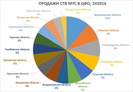 Лидером по подключениям СТВ МТС стала Воронежская область — 11% всех продаж услуги в регионах ЦФО (см. диаграмму). Также в ТОП-5 по подключениям услуги вошли Тверская, Белгородская, Липецкая и Тульская области. Рекордсменом роста продаж среди ТОП-5 регионов стала Липецкая область — в июле 2016 г. было продано в 18 раз больше комплектов СТВ МТС, чем в декабре прошлого года.