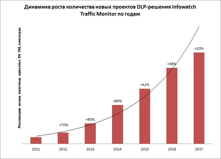 Группа компаний (ГК) InfoWatch отмечает рост числа проектов внедрений решения для предотвращения утечек конфиденциальной информации и защиты бизнеса от внутренних угроз (DLP-системы) InfoWatch Traffic Monitor на 20% в 2017 г. (см. рисунок 1). Кроме того, в два раза увеличился спрос на обновление до последней версии DLP-продукта со стороны действующих клиентов InfoWatch.