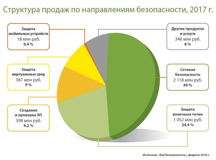 Тройку лидеров продаж по итогам 2017 г. составили такие средства защиты, как АПКШ «Континент» (2118 млн руб.), ПАК «Соболь» (455 млн руб.) и Jinn (398 млн руб.), уже отмеченный ранее в качестве самого динамично растущего продукта.