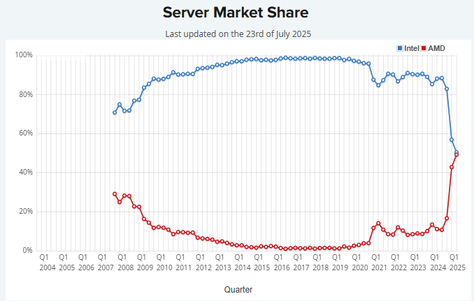 Однако неурядицы последних нескольких лет не прошли для Intel даром и на этом направлении: согласно статистическим выкладкам на портале PassMark, по итогам I кв. 2025 г. доля активных серверов с процессорами AMD впервые в истории практически достигла 50% — это притом, что всего за пару кварталов до того она едва подбиралась к 20%.