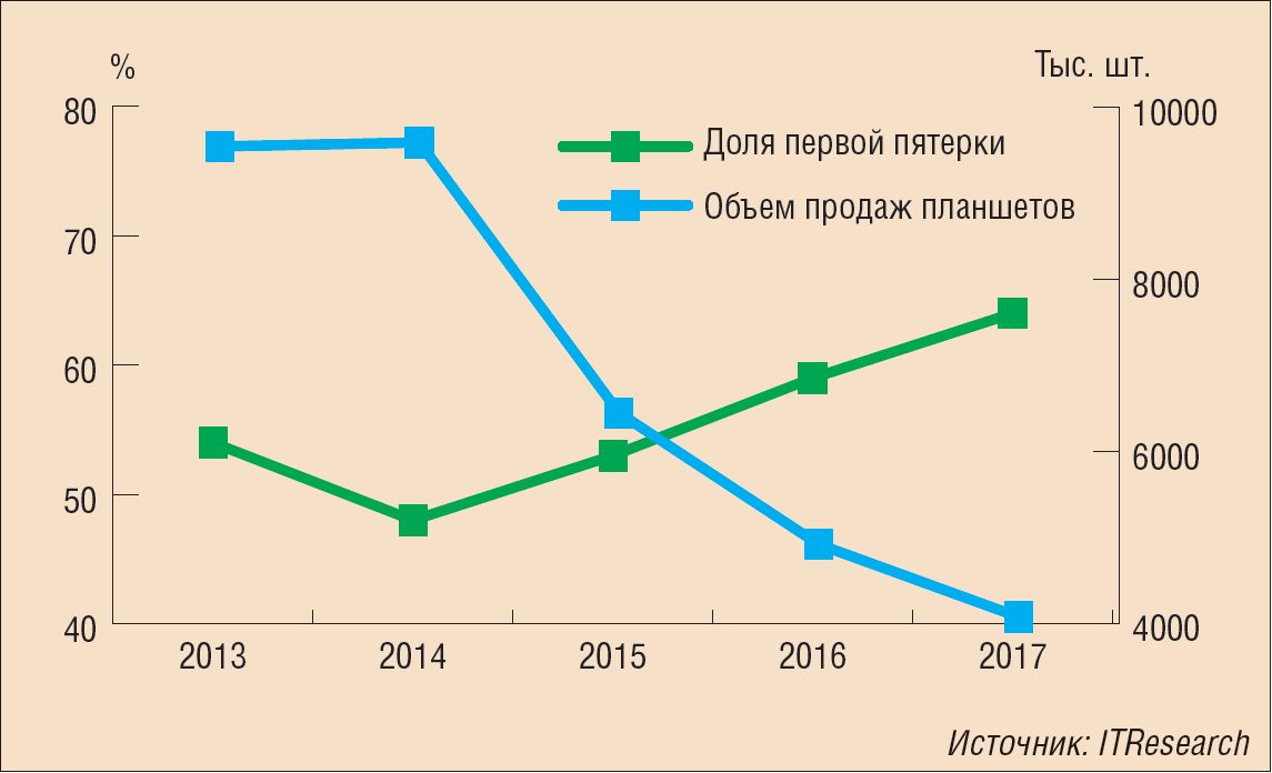 По данным аналитической компании ITResearch на долю лидирующей пятерки поставщиков планшетных компьютеров на российском рынке по итогам 2017 г. пришлось почти 65% поставок в натуральном выражении.