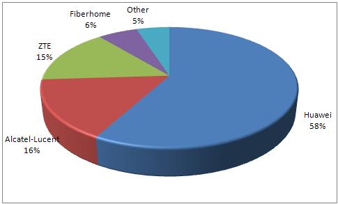 Рейтинг производителей рынка GPON производительностью 2,5 Гбит/с (2,5G GPON) в странах BRIC возглавляет китайская фирма Huawei, продукция другого китайского производителя — ZTE — тоже присутствует на рынках всех четырех стран. В Бразилии и России фиксируются высокие темпы роста, но объем рынка в Китае все равно больше.