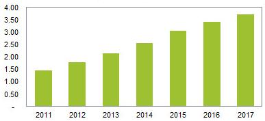 По данным iSuppli, в 2013 г. объем продаж чипсетов технологии Wi-Fi достигнет 2,14 млрд штук, т. е. их будет продано на 20% больше, чем в 2012 г. (1,78 млрд шт). Аналитики отмечают, что эта тенденция роста спроса и рынка Wi-Fi началась не вчера, а уже примерно 5 лет назад, и двузначный рост будет продолжаться по крайней мере до 2016 г. Затем, по мнению iSuppli, рост будет относительно постоянным, равным примерно 9%. К 2017 г. объем продаж чипсетов Wi-Fi достигнет 3,71 млрд штук (см. диаграмму).