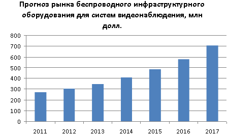 Согласно исследованию мирового рынка беспроводного инфраструктурного оборудования для систем видеонаблюдения, проведенного фирмой IMS Research (входит в состав IHS), его объем в 2012 г. составил 300 млн долл., а рост по сравнению с 2011 г. -- 11%, и эта тенденция продолжится, по крайней мере, до 2017 г., когда рынок может вырасти на 160% (в сравнении с 2011 г.) и достичь 705 млн долл.
