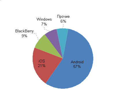 Согласно исследованию аналитической фирмы ABI Research, мировая инсталляционная база смартфонов к концу 2013 г. составит 1,4 млрд устройств, 57% которых будут использовать в качестве ОС Android, а 21% -- iOS. При этом с планшетами ситуация обратная: из проданных пользователям к концу 2013 г. 268 млн на Android’е будут работать 28%, а на iOS -- 62% устройств (см. рисунок).