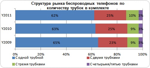 По оценкам специалистов аналитического центра, процентное соотношение количества трубок за прошлый год не претерпело значительного изменения. Наибольшей популярностью продолжают пользоваться модели с одной трубкой (62%). Сегмент телефонов с несколькими трубками достиг 38%. Спрос на модели с двумя трубками составил 25%, с тремя и четырьмя-пятью — 10% и 3% соответственно (рис. 2).