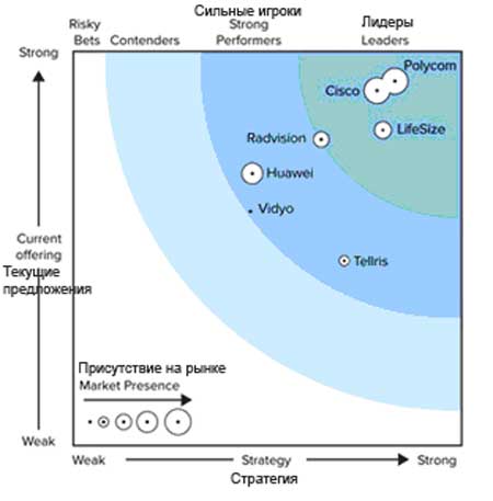 Исследовательская компания Forrester Research обнародовала краткие результаты отчета «Forrester Wave: комнаты с, Q3 2012», в котором ведущие поставщики решений в отрасли оцениваются на основании 39 критериев. При этом рассматриваются решения для совместной работы с использованием видеосвязи (которая, по данным Forrester, становится все более распространенной) для любых рабочих условий — от мобильных и настольных устройств до конференц-залов и комнат телеприсутствия, а также сопровождающие их услуги. В отчете отмечается растущий интерес компаний к совместной работе в режиме видео «лицом к лицу» (face to face), который помогает повысить продуктивность бизнеса и сократить затраты.