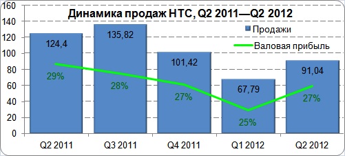 Тайваньская компания HTC объявила финансовые результаты 2-го квартала 2012 г., которые вполне соответствовали ее пересмотренным прогнозам. Консолидированный оборот компании во втором квартале составил 91,04 млрд новых тайваньских долларов (NT$), что соответствует 3,04 млрд долл. США, в то время как первоначально компания предполагала достичь показателя NT$105 млрд, а затем опустила планку до NT$91 млрд. Во втором квартале HTC удалось поднять продажи на 34,3% по отношению к первому кварталу, однако они все-таки оказались на 26,8% меньше, чем в 1-м квартале 2011 г. Чистая прибыль HTC составила NT$7,4 млрд или NT$8,90 на акцию. Прибыль во 2-м квартале 2012 г. за год упала более чем на 50%, однако в квартальном измерении выросла более чем на 60% (см. диаграмму). Валовая прибыль подросла, но также не достигла показателя годовой давности. Как и прежде, HTC объясняет падение доходов усиливающейся конкуренцией на рынке смартфонов.