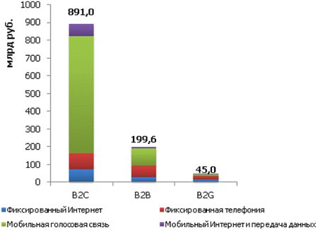 Общий объем рынка основных телекоммуникационных услуг в сегменте B2C по итогам 2011 г. достиг 891 млрд руб. В сегменте B2B выручка поставщиков от данных услуг почти в 4,5 раза меньше – 199,6 млрд руб. Государственный сектор расходует на эти виды услуг 45 млрд руб. Доля частного (потребительского) сегмента в структуре доходов операторов от основных услуг составляет 78%. На сегмент B2B приходится 18% рынка и на государственный сектор – 4%.