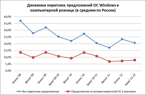 Компания Microsoft подвела итоги зимней волны программы мониторинга пиратства в компьютерной рознице в регионах России. В ходе проверки 20,6% из 3 тыс. торговых точек в 94 городах России в том или ином виде предложили своим клиентам нелицензионную ОС Windows. Несмотря на снижение доли пиратских предложений в последние месяцы (осенью она составила 23,7%), за последний год — с декабря 2010 г. — уровень пиратства в торговых точках России практически не изменился (20,6% против 20,4% год назад).