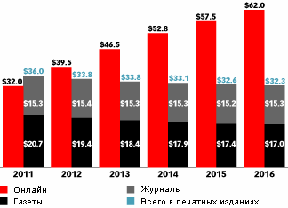В дальнейшем доходы американских газет и журналов от рекламы будут продолжать медленно падать, а реклама в Интернете будет показывать устойчивый рост. В итоге, как пишет eMarketer, к 2016 г. расходы на рекламу в Сети составят уже 62 млрд долл (см. рис).