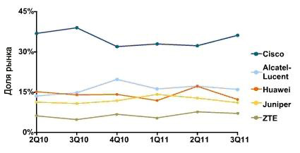 По данным аналитиков, четверо ведущих производителей рынка граничных IP-маршрутизаторов и коммутаторов — Alcatel-Lucent, Huawei, Juniper и ZTE — в 3 кв. 2011 г. показывают снижение продаж, выраженное двузначным числом. В то же время Cisco нарастила обороты, продемонстрировав поквартальный прирост в 3% с результатом в денежном выражении — 1,43 млрд долл., что вернуло ей былое лидерство с долей рынка в 36,2 %. За ней следуют Alaxala, Ericsson, NEC и Nokia Siemens, которые тоже показали увеличение продаж в 3 кв. 2011 г. Один из основных конкурентов Cisco — Huawei, напротив, в этом периоде снизил свою долю рынка с 17,2 % (2 кв. 2011 г.) до 12,3%.