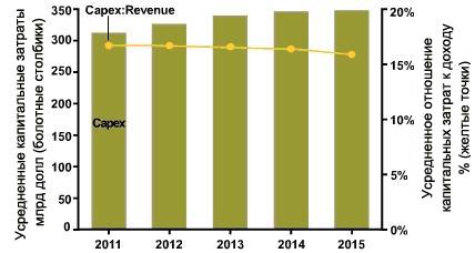 Интересно, что при общем ажиотаже вокруг LTE наиболее быстрорастущими по капитальным затратам в 2011 г. технологическими областями оказались: WiMAX-оборудование (рост на 27,5%) и оборудование видео инфраструктуры (20,7% роста). Но самыми капиталоемкими остаются отнюдь не оборудование для связи и передачи данных, а «сопутствующие товары» (программные средства, недвижимость, кадры и т. п.), а также инфраструктура мобильной связи. Глобальные инвестиции в эти области в 2011 г. по сравнению с 2010 г. выросли на 7 и 8,6% соответственно. Операторы, чей бизнес — только беспроводная связь, по оценкам Infonetics, будут особо активно наращивать инвестиции, и к 2015 г. их суммарные капиталовложения составят одну треть затрат глобального телекоммуникационного операторского рынка.