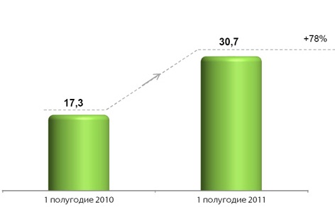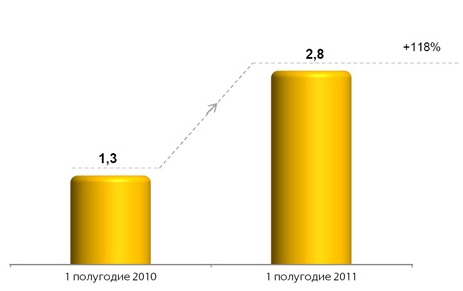 Рис. 2. Объем продаж смартфонов в 1 полугодии 2010 и 2011 года (млрд. руб).