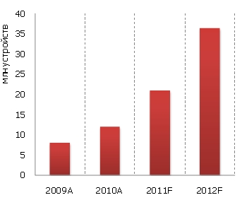 Сегодня наблюдается стремительный рост рынка смартфонов, в 2010 г. он вырос на 50%. Как ожидает J’son & Partners Consulting, по итогам 2011 г. этот рынок увеличится еще на 75% (рис. 1). Ключевые каналы доставки рекламных сообщений на мобильные устройства будут определяться этим динамично развивающимся рынком.