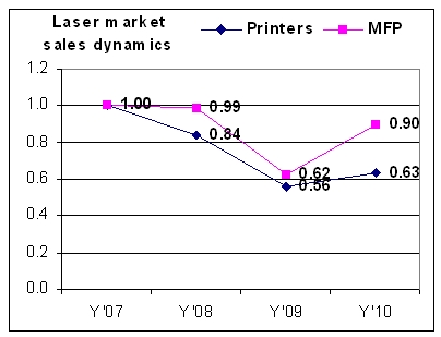 Обозначившееся еще в докризисный период постепенное ослабление спроса на лазерные принтеры, с появлением экономических трудностей во второй половине 2008 г., быстро перешло в падение, несколько ускорившееся в 2009 г. А всего за это время данный рынок сократился больше чем на 40%.